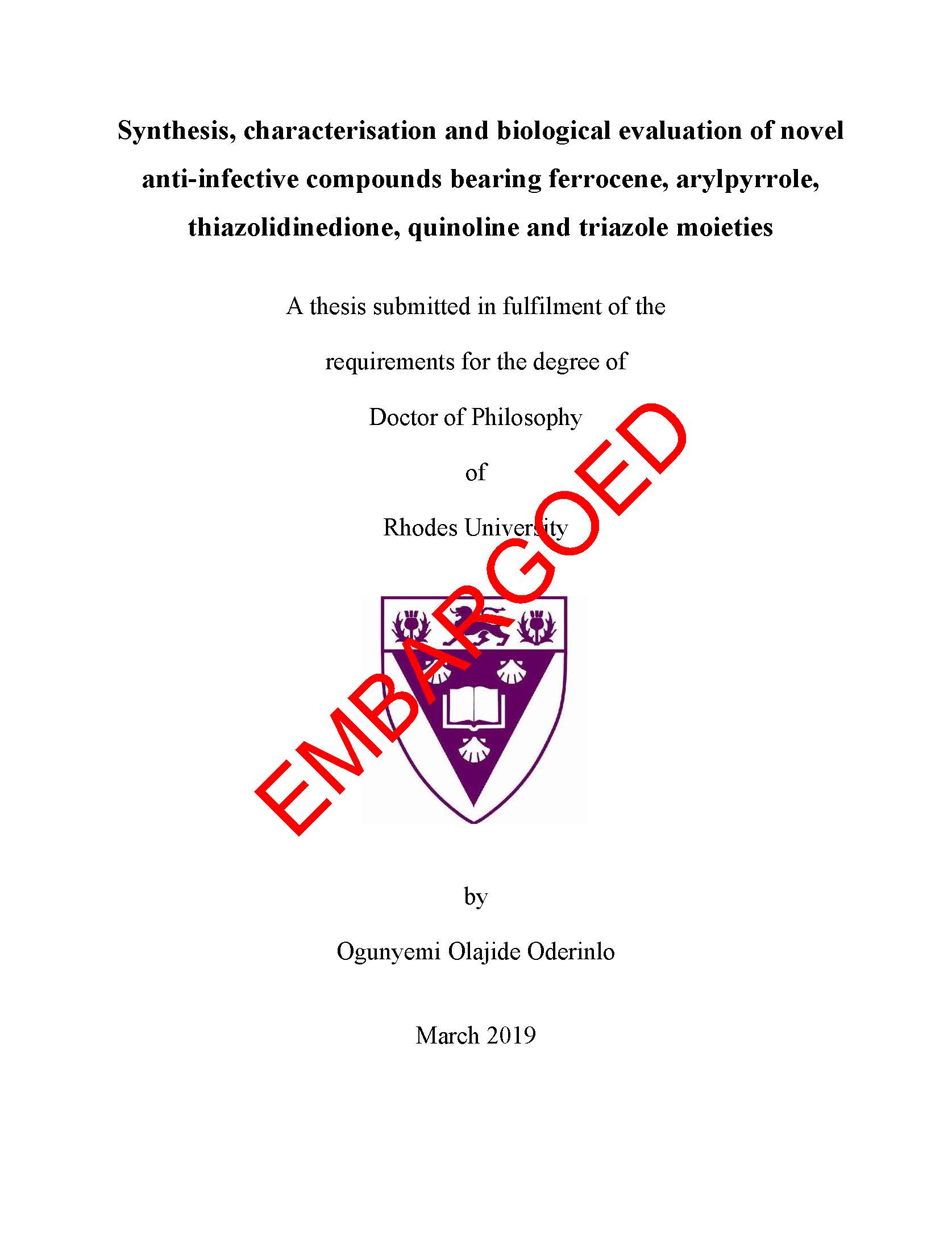 Synthesis, characterisation and biological evaluation of novel anti-infective compounds bearing ferrocene, arylpyrrole, thiazolidinedione, quinoline and triazole moieties